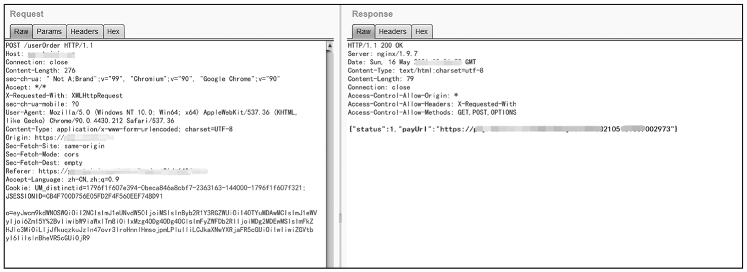 攻击目标是一个电商类网站,在商城中选好商品并且填写收货信息后,点击微信支付时抓包进行查看,如图1-244所示,发现o参数是Base64编码的订单信息。