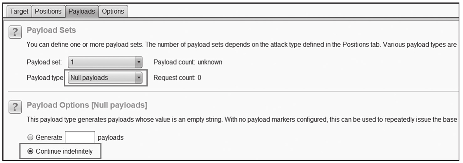 然后将数据包发送到Burp Suite的Intruder模块中,将系统自动设置的参数全部清除,Payloads设置为Null payloads,如图1-252所示。此次并发漏洞场景不需要爆破任何参数,只需要Burp Suite多线程一直发包。