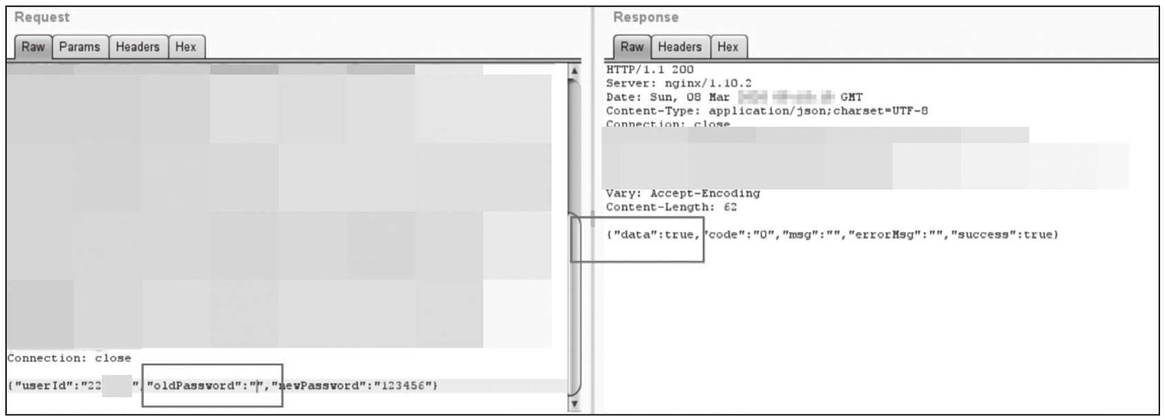 我们在修改密码时抓包分析一下,如图1-271所示,当原密码错误时,服务端返回了false,并且是根据userId的值对原密码进行的判断,当userId的值与原密码匹配时才能修改成功。
