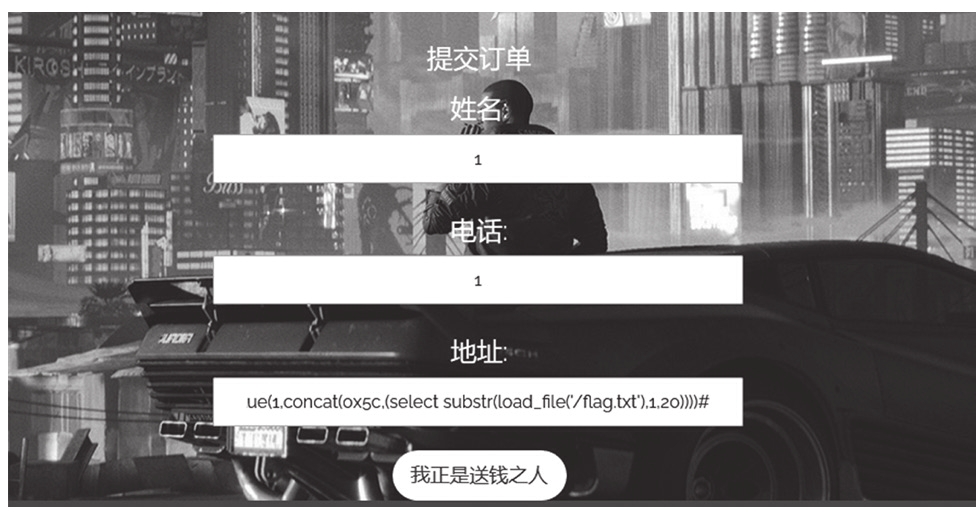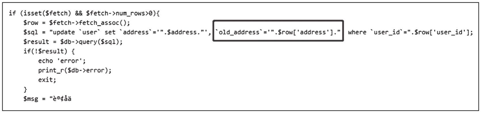 可以看到,address虽然经过了过滤,但是在修改地址的时候从数据库中取出的是没有过滤直接带入的SQL语句,从而导致SQL注入,如图1-31所示。
