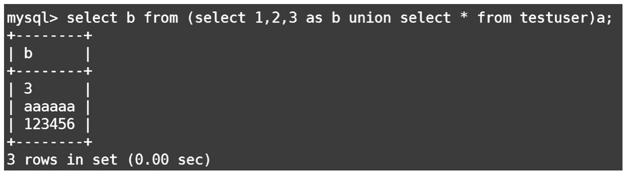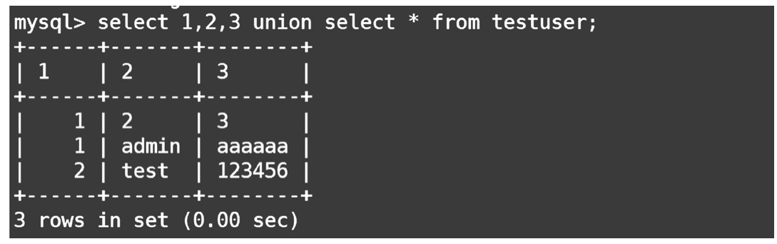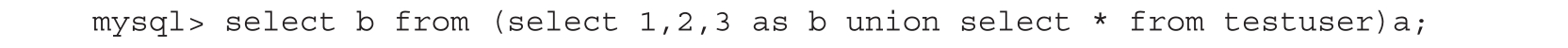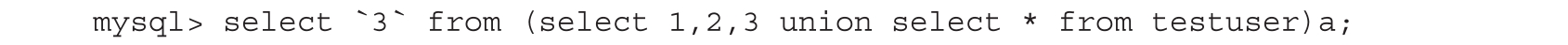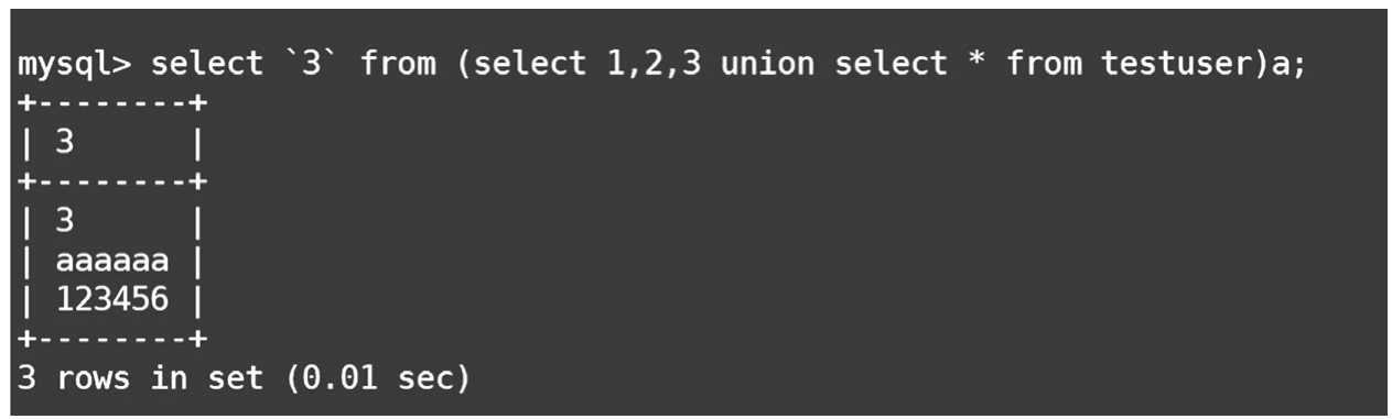 利用数字3代替未知的列名,需要加上反引号。代码后面加了一个a,是为了表示这个表(select 1,2,3 union select*from testuser)的别名,如图1-38所示。