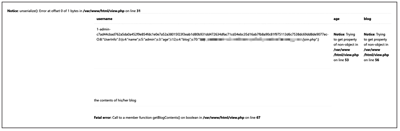 以2018-网鼎杯-Fakebook题目为例,本题的原理和上一题基本相同,都是先将可控点的值设为恶意代码,然后由Web程序带入另一段有漏洞的代码中实现利用。可以理解为SQL注入起到的只是控制变量的作用。该题目首先具有源码泄露,如图1-49所示。