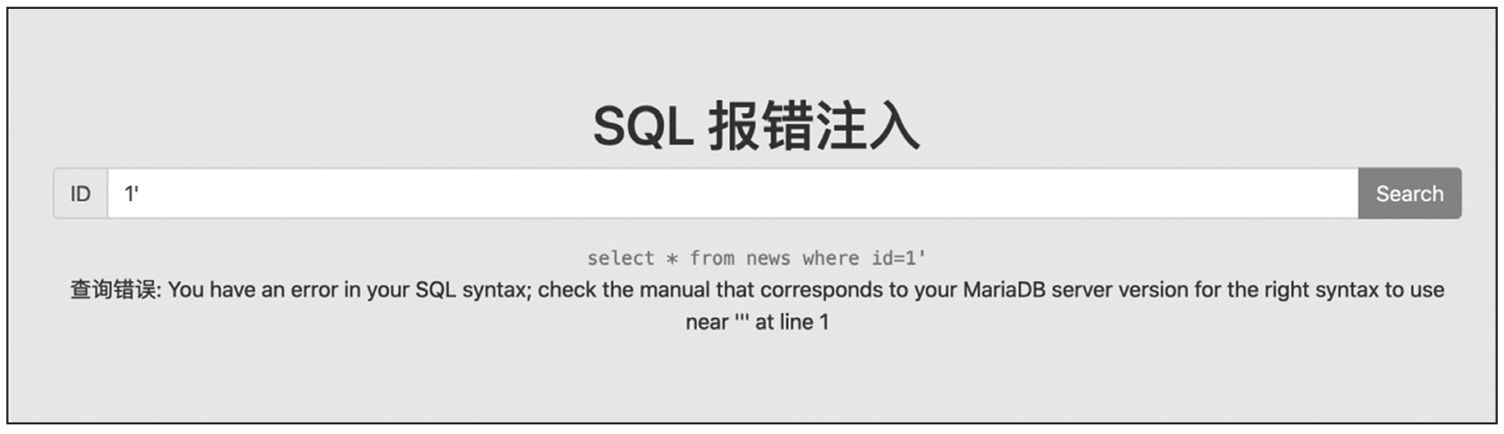 下面以CTFHub技能树中的报错注入靶场为例进行介绍。打开靶场输入参数1',结果如图1-8所示。
