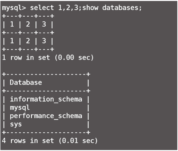 顾名思义,堆叠注入就是一堆SQL语句一起执行。在MySQL语句中,每条语句的结尾都有一个“;”,代表一条语句结束。我们将多个SQL语句用“;”连接起来,就可以达到多条语句一起执行的效果,从而造成SQL注入。堆叠注入和union联合查询本质上都是将两条语句连接在一起执行,区别在于union查询只能连接两条查询语句,而堆叠注入可以连接两条任意的语句。当WAF没有过滤show、rename、alert等关键词时,我们就可以考虑使用堆叠注入。