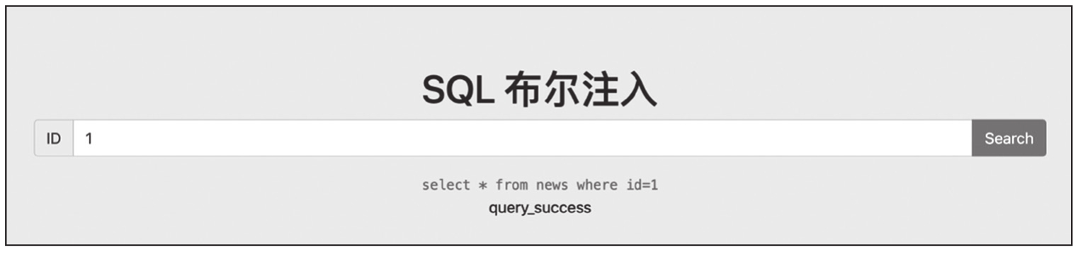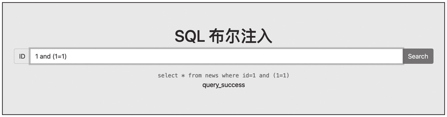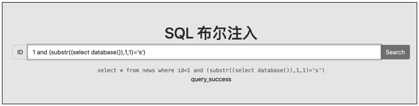 可以看到,输入1 and(substr((select database()),1,1)='s')的回显结果为query_success,说明数据库名的第一个字符为s。执行结果如图1-19所示。