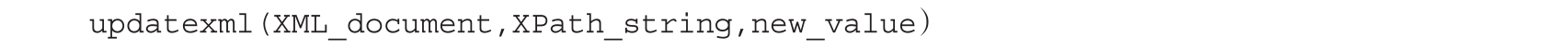 使用updatexml()函数时,如果XPath_string格式出现错误,MySQL会爆出语法错误(XPath syntax)。与extractvalue()函数相同,updatexml()函数在MySQL 5.1.5版本添加,使用它进行报错注入时,需要满足MySQL版本号大于或等于5.1.5。