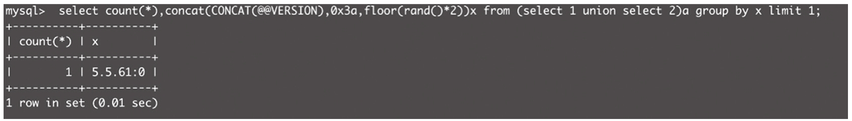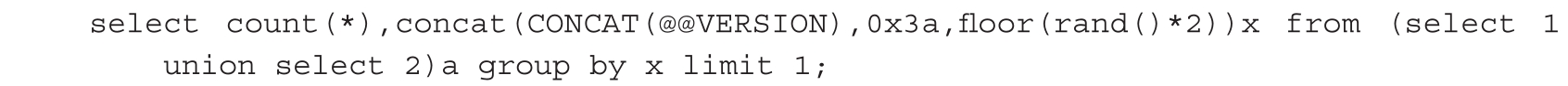 首先利用floor(rand(0)*)产生预知的数字序列01101,然后利用rand()函数的特殊性和group by语法中的虚拟表,引起报错。MySQL版本号需要大于或等于4.1,代码如下。