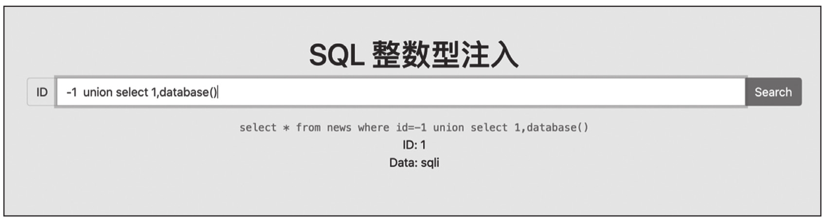 这里id=-1的原因是回显数据的时候只会显示一条数据,需要让第一个select语句查询返回空。结果如图1-1所示,数据库名为sqli。