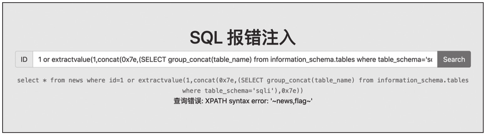虽然得到了数据库sqli中的一个表名为news,但是数据库中一般会有多个表,当出现需要查询的数据不只一条,而回显只能显示一条数据的情况时,可以通过group_concat()函数将多条数据组合成字符串并输出,或者通过limit函数选择输出第几条数据。