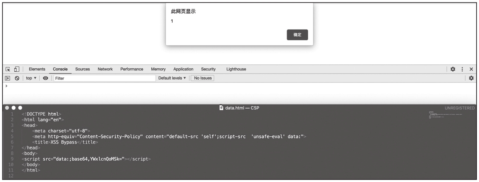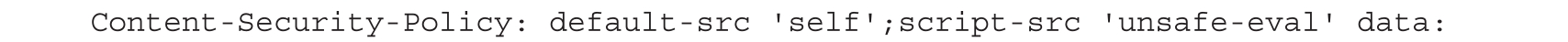 不允许加载外部资源,并且不允许加载内联JavaScript代码,但是配置了unsafe-eval指令值,使用了data配置,可通过Base64编码Payload,代码如下,结果如图1-71所示。
