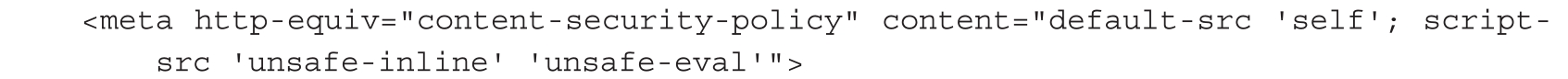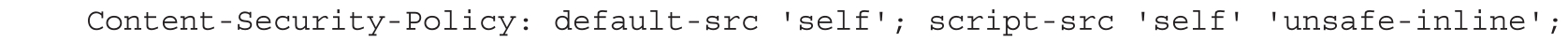 我们配置一个常见的CSP,代码如下。允许执行内联JavaScript代码,但不允许加载外部资源。