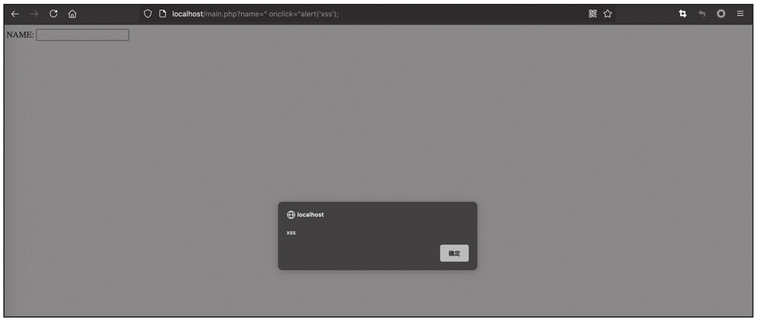 利用事件对象onclick语法执行JavaScript语句,当用户点击对象时调用其事件句柄。在浏览器中输入Payload:?name="onclick="alert(xss);,执行结果如图1-58所示。
