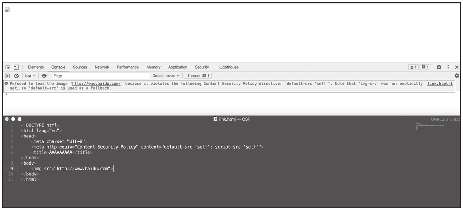 我们也可以通过link标签进行预加载。如下代码是一个简单的CSP规则,不允许加载外部资源,我们用img标签引入baidu.com的图片时就会被阻止,如图1-73所示。