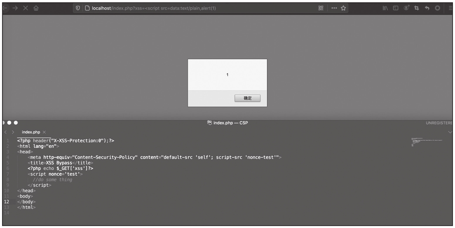 如图1-77所示,Payload拼接到页面上就是成功劫持了nonce='test'属性,并且执行了我们构造的alert函数。