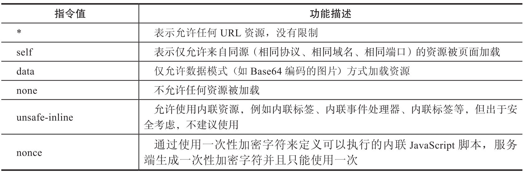 CSP可以通过两种方式进行设置,在HTTP的消息头中设置,或者在HTML的Meta标签中设置。正常的CSP配置由多组策略组成,每组策略包含一个策略指令和一个内容源列表,如表1-3、表1-4所示,每组策略之间由分号分隔。CSP主要是通过限制JavaScript的执行、限制跨域请求来防御XSS的。
