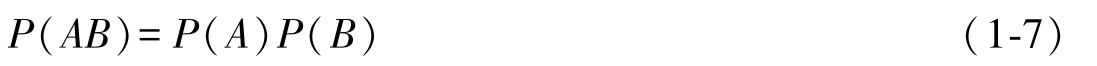 定理1-2 :如式(1-7)所示,两个独立事件 A 、 B 之积 AB 的概率 P ( AB ),等于其各自概率之积 P ( A ) P ( B ),称为概率的乘法定理。