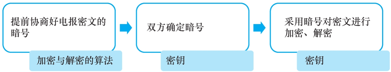 下面通过示例说明对称加密算法。某次战争时期红方3军团与红方5军团要使用电报进行情报交流,但不能被其他人知道,电报需要以密文形式发送,双方会进行如图2-4所示的几个步骤。