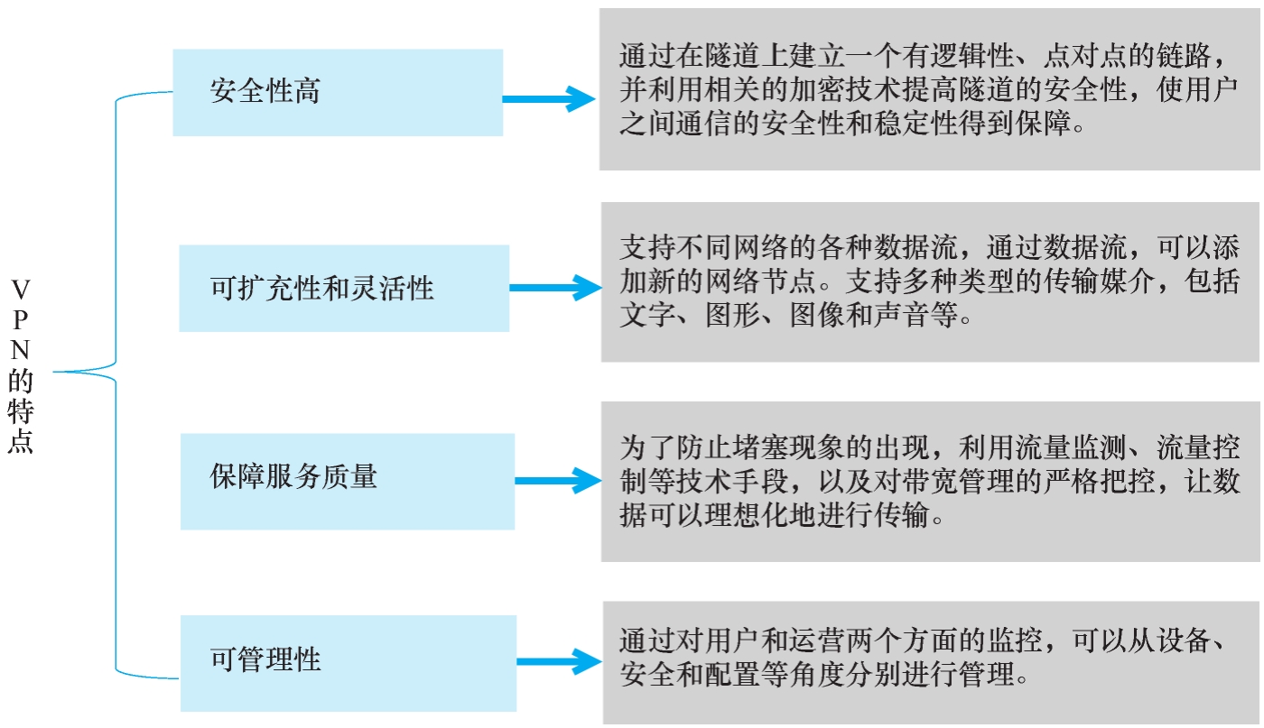 与传统的广域网相比,VPN可以减少企业的运营成本和连接成本,在公用网络上建立专用网络进行加密通信,其特点如图2-2所示。
