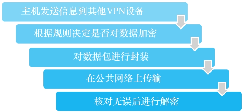 在用户相互通信的过程中,VPN会保护主机发送明文信息到其他VPN设备。然后根据网络管理员设置的规则,确定是对数据进行加密还是直接传输。之后会对需要加密的数据加上新的数据报头重新封装。封装后的数据包会通过隧道在公共网络上传输。数据包到达目的VPN设备后将其解封,核对数字签名无误后,对数据包解密。