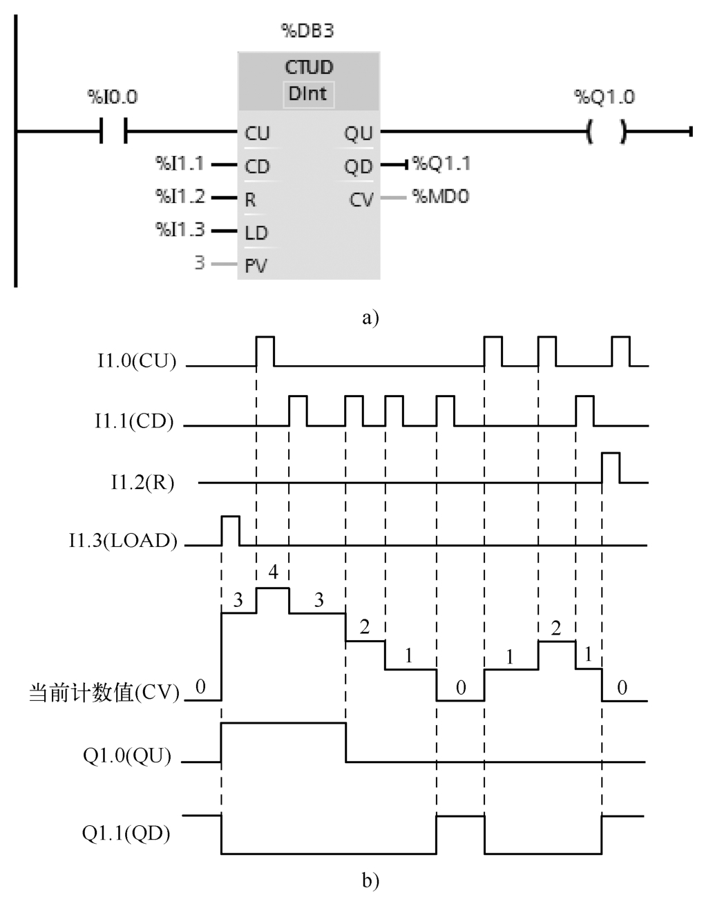 加减计数器如图1-41a所示,图1-41b为其工作时序图。在图1-41中,CTUD表示加减计数器,图中计数器数据类型是整数,预设值PV为3,其工作原理如下。