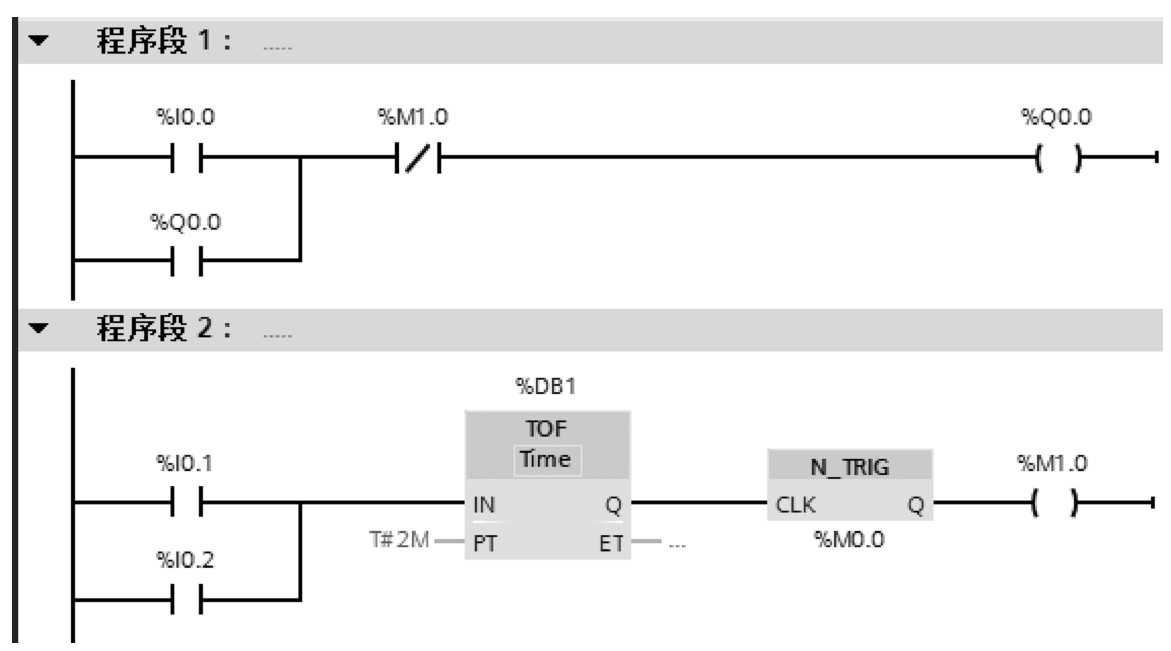 【例1-3】 通过关断延迟定时器实现电动机停止后其冷却风扇延时2min后停止,如图1-36所示。