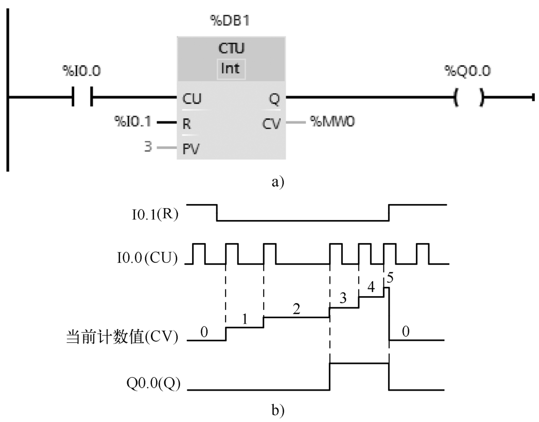 加计数器如图1-38a所示,图1-38b为其工作时序图。在图1-38a中,CTU表示加计数器,图中计数器数据类型是整数,预设值PV(Preset Value)为3,其工作原理如下。