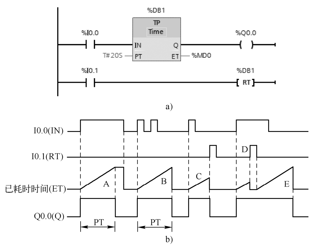 脉冲定时器类似于数字电路中上升沿触发的单稳态电路,其应用如图1-31a所示,图1-31b为其工作时序图。在图1-31a中,“%DB1”表示定时器的背景数据块(此处只显示了绝对地址,因此背景数据块地址显示为“%DB1”,也可设置显示符号地址),TP表示脉冲定时器。