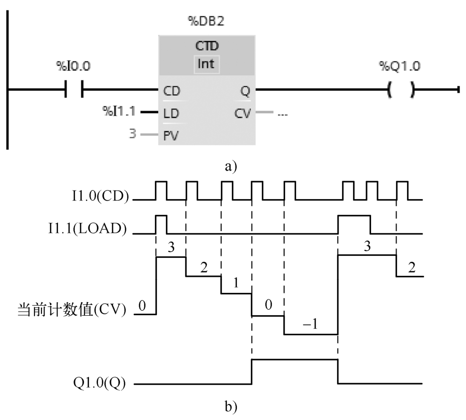 减计数器的装载输入LD(LOAD)为“1”状态时,输出端Q被复位为0,并把预设值PV装入CV。在减计数器CD(Count Down)的上升沿,当前计数值CV减1,直到CV达到指定的数据类型的下限值。此后CD输入的状态变化不再起作用,CV的值不再减小。
