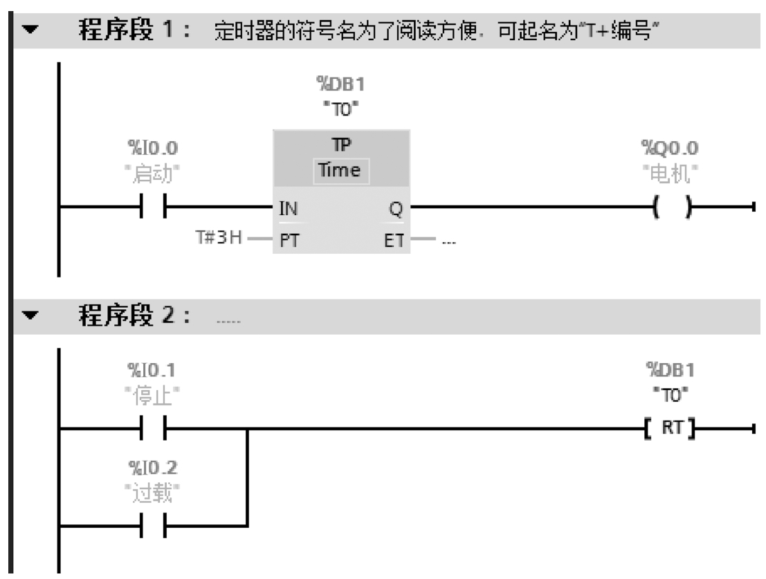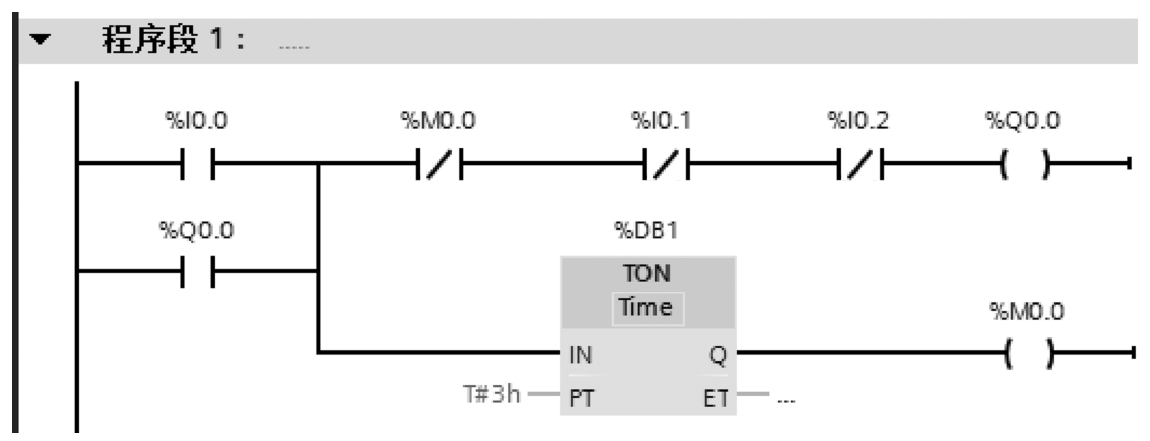 【例1-1】 按下起动按钮I0.0,电动机立即直接起动并运行,工作3h后自动停止。在运行过程中若发生故障(如过载I0.2接通),或按下停止按钮I0.1,电动机立即停止运行,如图1-32所示。