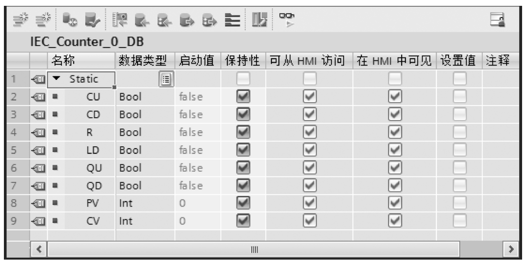 打开计数器的背景数据块,可以看到其结构如图1-39所示,其他计数器的背景数据块与此类似,不再赘述。