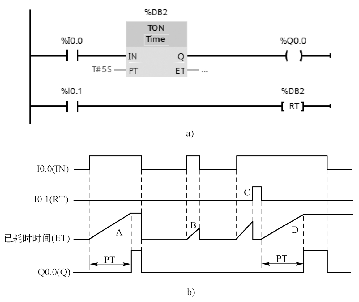 接通延时定时器如图1-33a所示,图1-33b为其工作时序图。在图1-33a中,“%DB2”表示定时器的背景数据块,TON表示接通延时定时器。