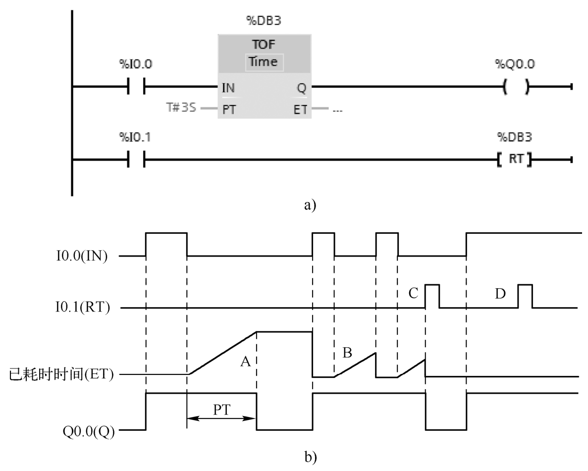 关断延时定时器如图1-35a所示,图1-35b为其工作时序图。在图1-35a中,TOF表示关断延时定时器。