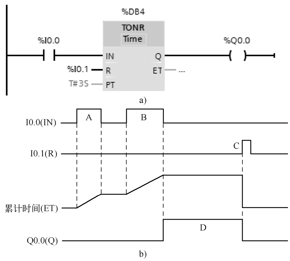 保持型接通延时定时器(又称时间累加器)如图1-37a所示,图1-37b为其工作时序图。在图1-37a中,TONR表示保持型接通延时定时器。