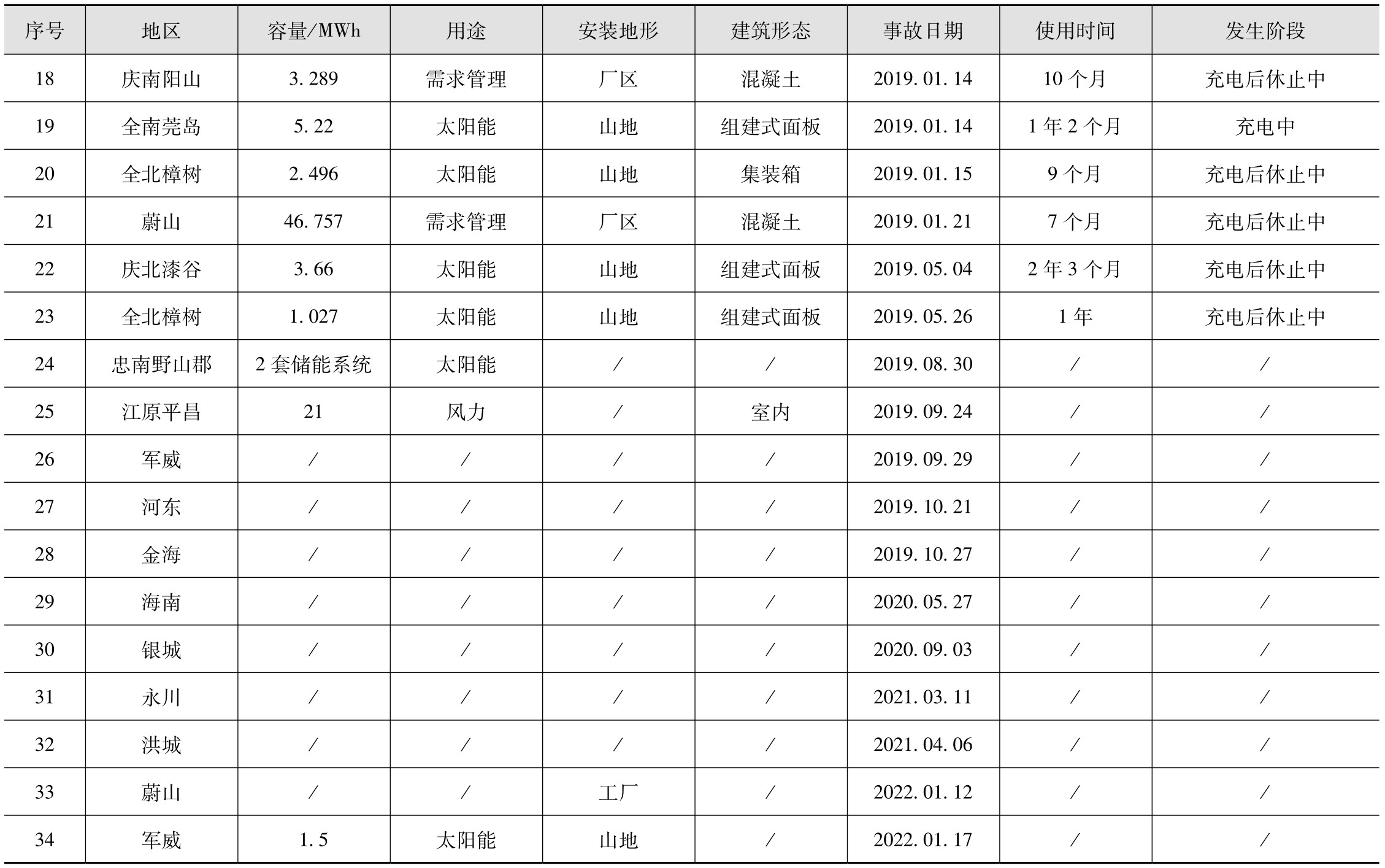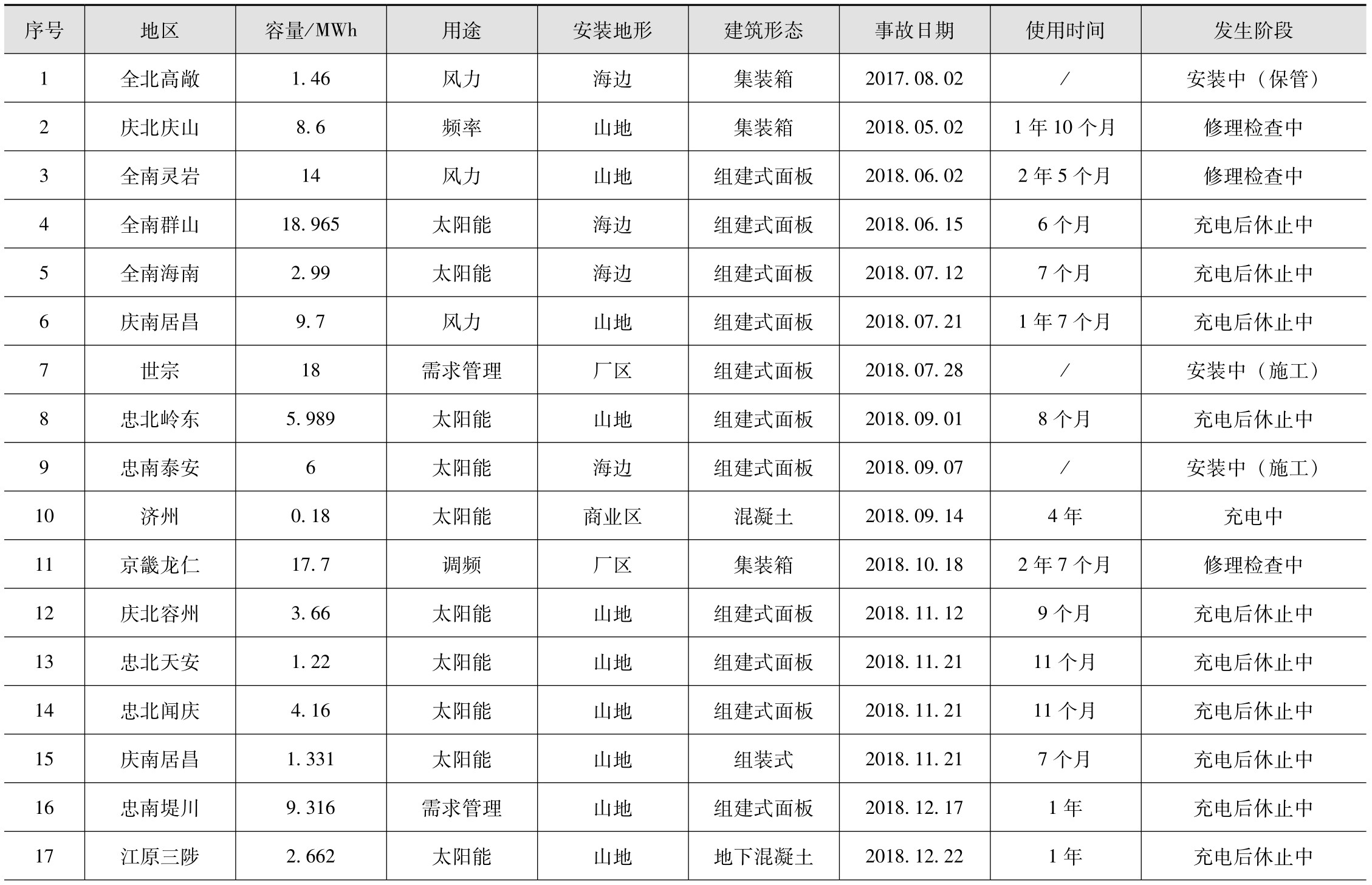 表2-1 韩国储能电站火灾统计