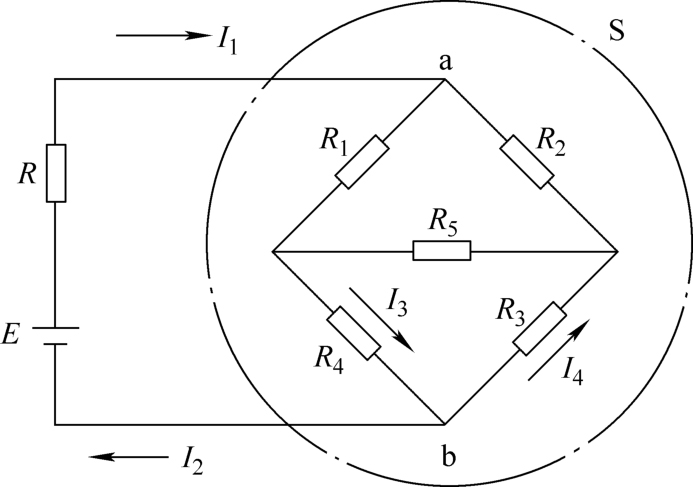 基尔霍夫第一定律不仅适用于节点,也可以推广应用于任意假定的封闭面。如图1-10所示的电路,假定一个封闭面S把电阻 R 1 ~ R 5 构成的电路全部包围起来,则流进封闭面S的电流应等于从封闭面S流出的电流,故得