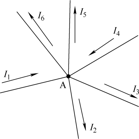 例如,对于图1-9中的节点A,有6条支路会聚于该点,其中, I 1 和 I 4 是流入节点的, I 2 、 I 3 、 I 5 和 I 6 是流出节点的,于是可得
