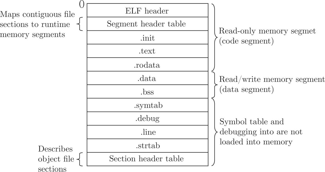 (3)可执行的目标文件。可执行的目标文件是由链接器生成的,其典型格式如图2.3所示。这种类型的目标文件包含了可以直接装载到内存并执行的二进制代码和数据。
