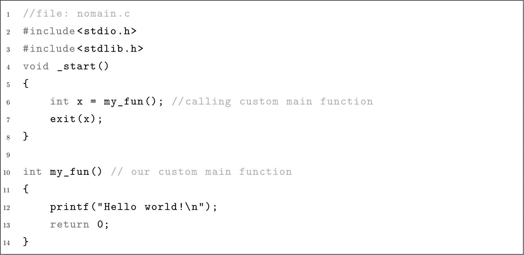 在编译nomain.c时,为了避免编译器使用默认的_start()函数,可以使用编译选项-nostartfiles做到这一点。例如: